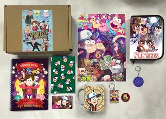 Каждая коробка собрана случайным образом, в нее входят 9 предметов: кружка, закатной значок, акриловый магнит, блокнот формата А6, тетрадь формата А5, брелок акриловый, пенал, брелок из метализированного пластика и плакат формата А4.