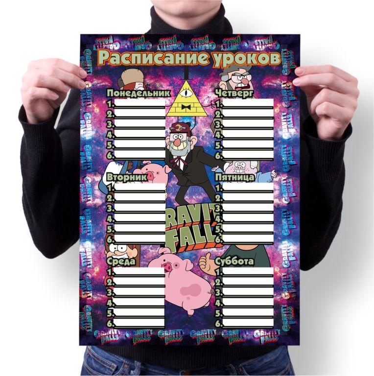 Расписание уроков Гравити Фолз, Gravity Falls №9 172 руб. Выберите размер расписания Выберите параметр Выберите размер расписания А4 А3 А2 А1 В корзину Форматы: А4 (29-21 см) А3 (42-29 см) А2 (60-42 см) А1 (84-60 см) Расписание уроков выполнены на качественной фотобумаге. Форматы: А4 (29-21 см) А3 (42-29 см) А2 (60-42 см) А1 (84-60 см) Расписание уроков выполнены на качественной фотобумаге.
